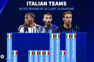 体育资讯2月26日讯 本轮欧冠附加赛,尤文加时憾负、国米被双杀出局,亚特兰大大逆转晋级。《转会市场》也统计了近年欧冠16强的意甲球队数量: