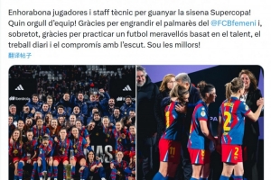 “感谢你们为巴萨女足的荣誉室再添奖杯。更重要的是,感谢你们凭借天赋、日复一日的努力,以及对队徽的承诺,踢出了如此精彩的足球。你们是最棒的!”