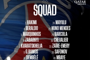 体育资讯1月28日讯 北京时间明天凌晨4点,欧冠联赛阶段第8轮,巴黎主场对阵纽卡,巴黎公布了此役球队大名单。