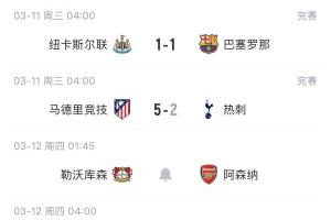 利物浦率先出战客场0-1不敌加拉塔萨雷,纽卡主场1-1遭巴萨绝平,热刺则是客场2-5惨败。