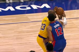 GIF-詹姆斯转身跳投被吹犯规 活塞挑战 变为不犯规且詹姆斯出界