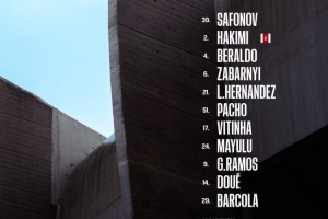39-萨福诺夫、2-阿什拉夫、4-贝拉尔多、6-扎巴尔尼、21-卢卡斯、51-帕乔、17-维蒂尼亚、24-马尤卢、9-贡萨洛·拉莫斯、14-杜埃、29-巴尔科拉